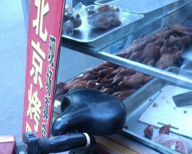 4月8日,記者對(duì)北京西站等地的烤鴨市場(chǎng)進(jìn)行了暗訪(fǎng)。北京西站旁的北蜂窩西路上,一個(gè)流動(dòng)攤販的推車(chē)前掛著“北京烤鴨25元/只”的牌子。推車(chē)的玻璃柜里陳列著20多個(gè)烤好的鴨子,玻璃柜上方還放著已經(jīng)包裝好的“全聚德”和“金聚福”的烤鴨,旁邊還有幾個(gè)全聚德烤鴨的包裝袋。