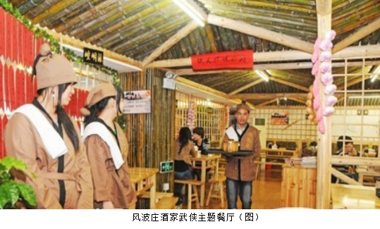 在這家餐廳,筷子不叫筷子,叫雙節(jié)棍。顧客是大俠,點(diǎn)菜得找莊主。這餐廳裝璜其實(shí)非常簡陋,不過因?yàn)橛袆?chuàng)意,生意倒是天天滿座。