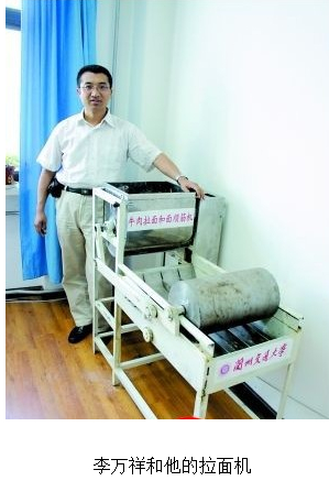 這種拉面機(jī)長(zhǎng)1.8米,高1.5米,寬80厘米,一般拉面店都能放得下。1.5千瓦的拉面機(jī)20分鐘就能完成50斤面的全部和面、揉面、甩面、順筋、拉面工序。在李萬(wàn)祥的辦公室,記者看到,從機(jī)器出口處倒入水和面粉,出口處便可得到成型的面棒,甚至面條。如果用人工,一個(gè)人需8小時(shí)才能完成這些工序。“不過(guò)我現(xiàn)在并不想直接生產(chǎn)出來(lái)拉面的面條,主要怕老百姓一時(shí)接受不了。”