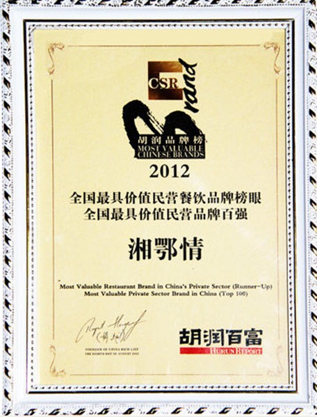 湘鄂情登2012胡潤(rùn)全國(guó)最具價(jià)值民營(yíng)餐飲品牌榜眼