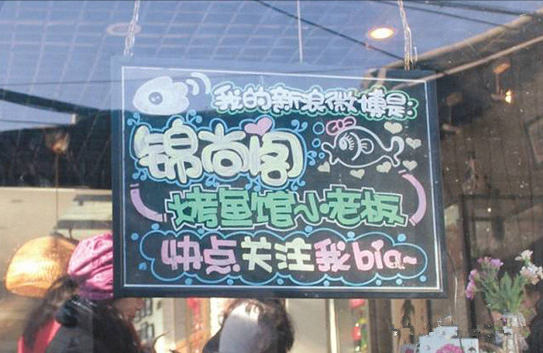 烤魚店開在胡同里,曲徑通幽,但人流量畢竟有限,作為廣告系畢業生的唐棠如何來推廣宣傳自己呢?唐棠介紹,她開店那會兒,趕上微博熱,于是她立即注冊了一個微博號,用戶名是“錦尚閣烤魚館小老板”,并附上自己的訂餐電話。在微博里,她每天勤勤懇懇地更新,內容不全是店里的廣告,而是很多開店的趣事以及自己的生活片段,比如有一條微博是這樣寫的:“員工因家鄉不同,一會兒有離職要去收麥子的,一會兒有離職要去敲松子的,一會兒又有要回家收玉米的……導致我現在對農廣天地的收獲時段了如指掌”;“來了一個帥得飛起來的男孩兒,女服務員們都瘋起來、爭著要服務這一桌,我批評了她們:服務行業怎么能失態不淡定!怎么能區別對待!你們知不知道,店是我的,你們是我的,好看的男客人也是我的!這桌我來服務,你們都忙別的去吧……”這些詼諧有趣的情節以及老板的美照俘獲了眾多同齡人的心,目前她的微博共吸引了5000多名粉絲。唐棠說:“只要勤更新,微博的宣傳效果的確非常顯著而且很持久,開店沒多久,粉絲們就源源不斷地上門來品嘗烤魚,有很多人成了小店的回頭客。到現在,我的新浪微博名字一直寫在小黑板上,掛在店外,來回經過的路人有時候也忍不住好奇心關注我的微博,變成潛在客戶。”