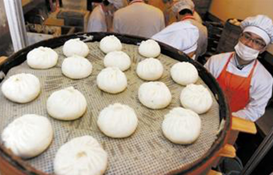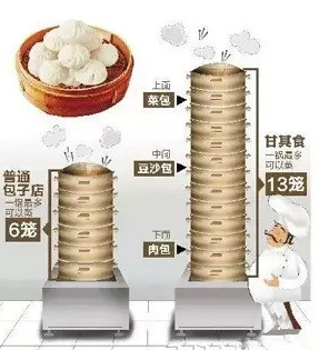 在甘其食,每個人都會看到壘得很高的蒸籠,如果細心一點你會發(fā)現(xiàn),其他包子店,頂多只能壘6層,不是不想多蒸幾籠提高效率,而是再高就熟不了了。甘其食最高能夠達到13層,“從9層到10層再到13層,這個是經(jīng)過了多少次試驗、重新定制蒸鍋等設(shè)備才能達到的。”童啟華說,不光如此,下面幾層以下只能蒸肉包,中間幾層蒸豆沙包等都是有白紙黑字規(guī)定的,最上面只能蒸青菜香菇包。“蒸包子是有講究的,肉是生的,青菜香菇是半熟的,一定要同時熟才行。”