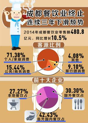 報(bào)告顯示,2014年成都餐飲業(yè)零售額480.8億元;同比增長(zhǎng)10.5%,較2013年6.3%的增速提升了 4.2 個(gè)百分點(diǎn);高于全國(guó)(9.7%)0.8個(gè)百分點(diǎn);高于四川省(10.1%)0.4個(gè)百分點(diǎn)。