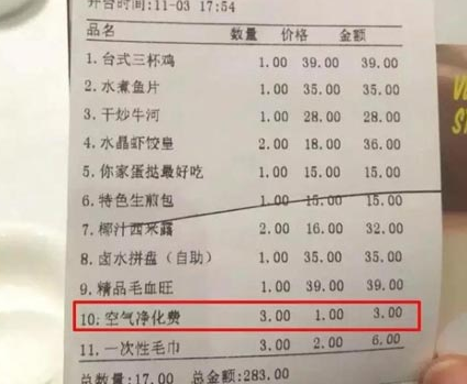 你可能用過空氣凈化器,也可能聽說過“空氣凈化費”,但你一定沒有在餐廳給過這項費用。近日,江蘇省張家港市一家餐廳因為違規收取“空氣凈化費”,被當地物價局警示。