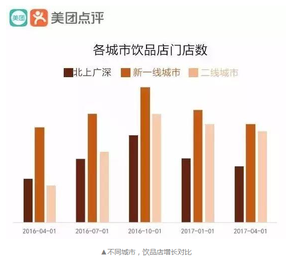 根據美團點評最新公布的一項數據顯示,2017年4月,二線城市飲品店門店數同比增長29%,而在北上廣深,這個數字是6%。