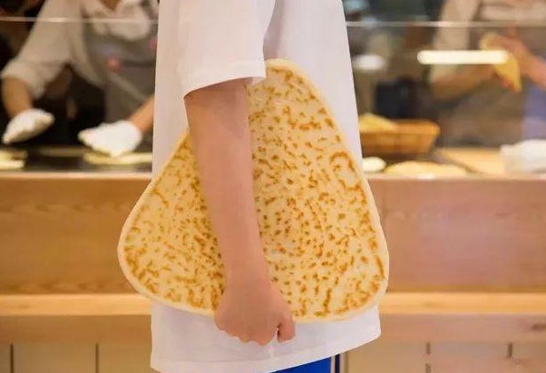 盡管店里的常規(guī)款肉夾饃已經(jīng)比外界的大一圈,這里還出了一款巨型肉夾饃,需要5個(gè)人才能吃掉1個(gè)。這塊饃夾在手里的感覺(jué)就像一塊三角形的盾牌。