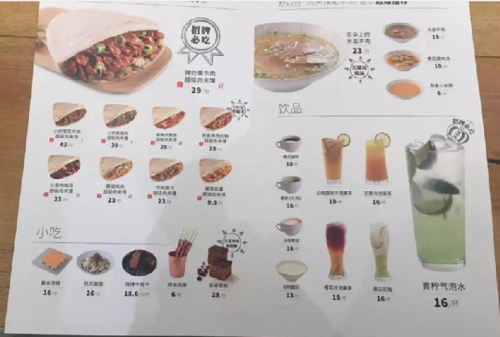 菜單整體以九種口味的肉夾饃搭配“小吃+熱湯+飲品”呈現(xiàn),包含水盆羊肉、嫩豆腐肉湯、燕麥小米粥和咖啡等7款飲品,以搭配肉夾饃的口感。